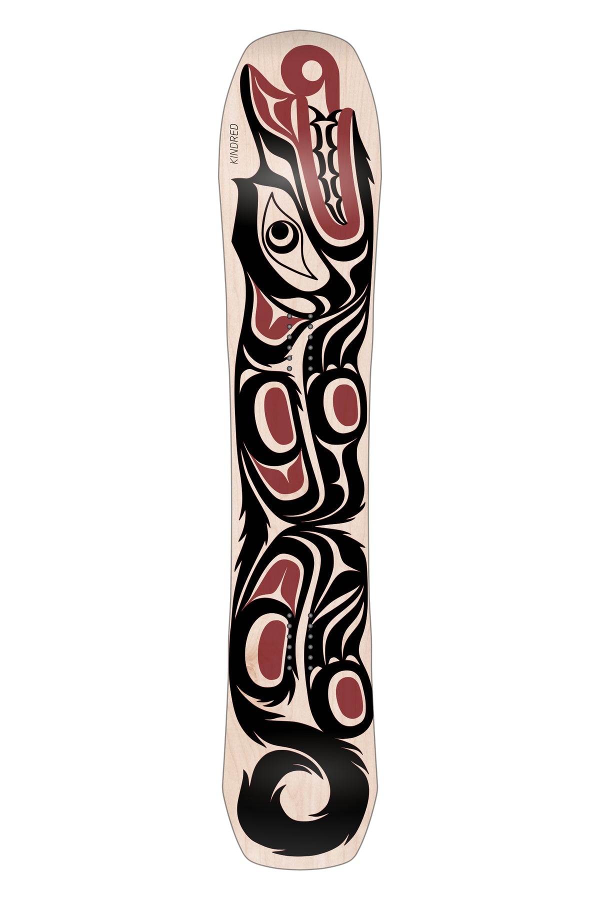 Woodgrain Kindred Ukee snowboard featuring a bold graphic coastal formline design of a wolf in black and red. Artwork by Karver Everson.