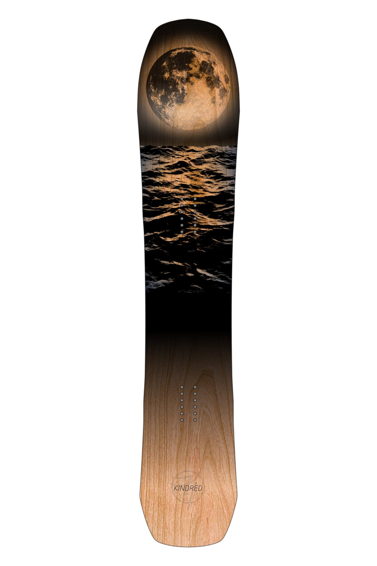 Wooden Kindred snowboard with a hand sketched  tree design in front of a glowing moon.