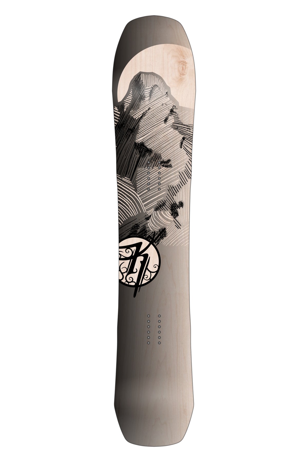 Kindred Ukee snowboard with mountain sketch artwork over maple wood topsheet. Agressive all mountain shape.