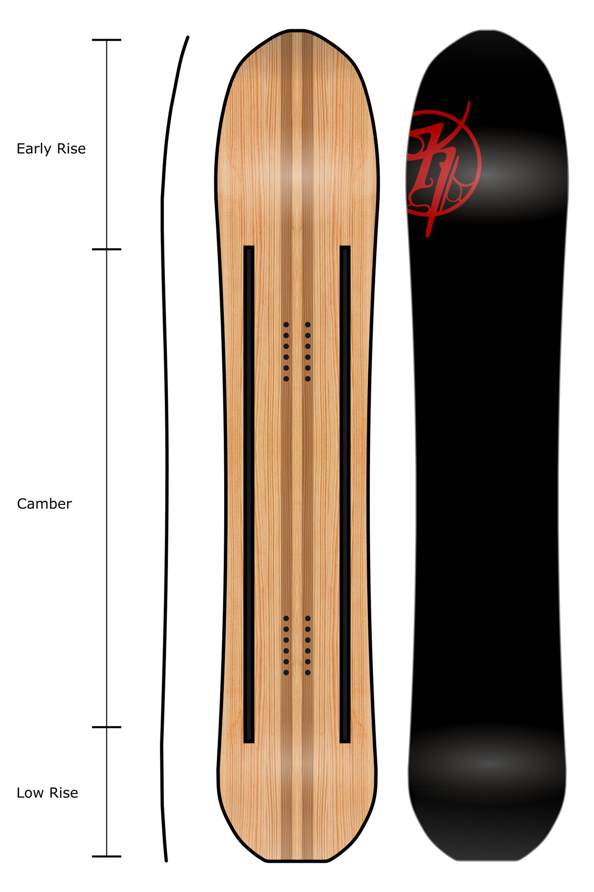 “I design boards to suit my own riding style. I love riding fast with the board and myself really tipped over. I’m always carving trenches. To ride in this aggressive manner, toe and heel drag are unacceptable. The wider overall width, mixed with specific flex pattern, sidecut and taper dimensions, allowed me to have the stability of a much longer board while maintaining super playful action in the tight spots that I often encounter. Oddly, the same details that allow this board to handle heavy G’s on groomers also loves a light touch while floating you to a euphoric state in the deep and fluffy.” - Mark Fawcett